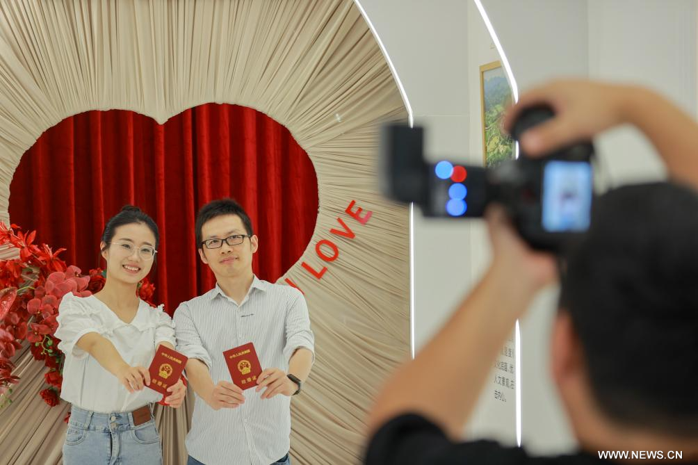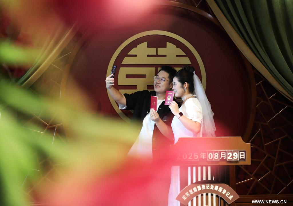 بكين 30 أغسطس 2025 (شينخوا) في الصورة الملتقطة يوم 29 أغسطس 2025، زوجان يلتقطان صورة بعد حصولهما على شهادة الزواج في أحد مراكز تسجيل الزواج بمدينة ووهو في مقاطعة آنهوي بشرقي الصين، وذلك بمناسبة عيد "تشيشي"، الذي يعتبر النسخة الصينية من عيد الحب.