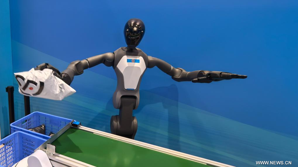 تيانجين أول سبتمبر 2025 (شينخوا) في الصورة الملتقطة يوم 30 أغسطس 2025، روبوت يفرز العبوات عبر التعرف البصري والإدراك اللمسي في المركز الإعلامي لقمة منظمة شانغهاي للتعاون 2025 في بلدية تيانجين بشمالي الصين.