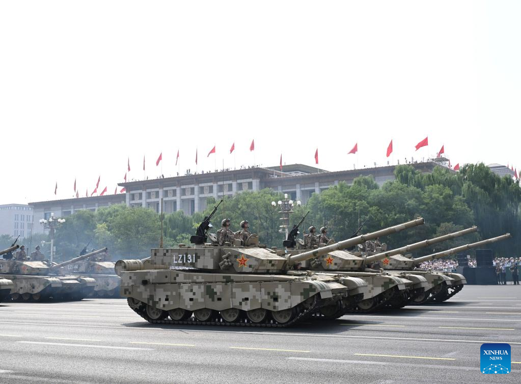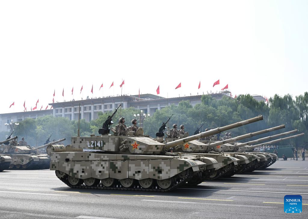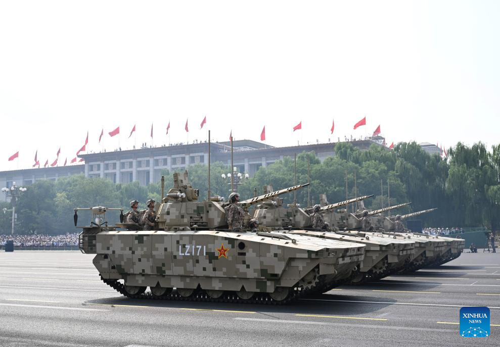 بكين 3 سبتمبر 2025 (شينخوا) مر تشكيل لوحدات الهجوم البري مكون من مركبات مدرعة من الجيل الجديد لجيش التحرير الشعبي، بما في ذلك الدبابات من طراز 100 والمركبات القتالية من طراز 100، بميدان تيان آن من.