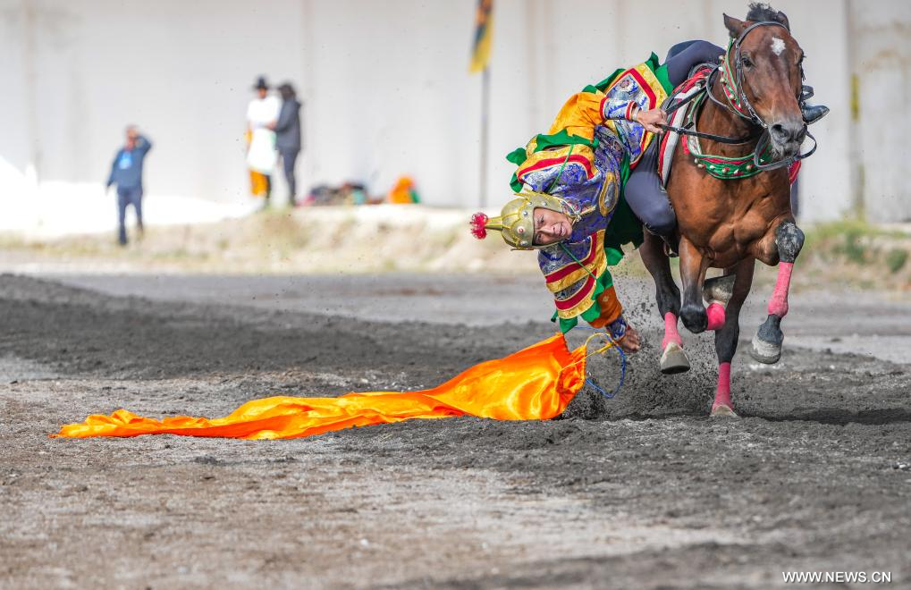ناتشيوي 7 سبتمبر 2025 (شينخوا) في الصورة الملتقطة يوم 5 سبتمبر 2025، فارس يقوم بأداء عرض فروسية خلال حفل افتتاح مهرجان سباقات الخيل التقليدي عام 2025 في ناتشيوي بمنطقة شيتسانغ ذاتية الحكم بجنوب غربي الصين.