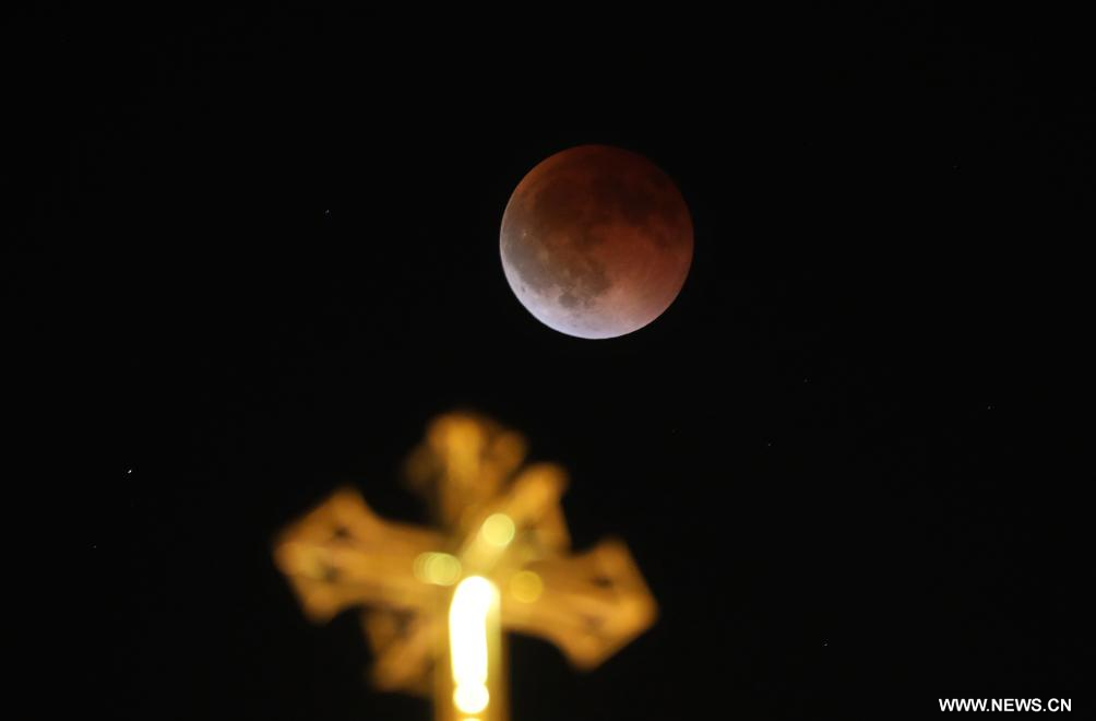 بيت لحم 8 سبتمبر 2025 (شينخوا) في الصورة الملتقطة يوم 7 سبتمبر 2025، مشهد لخسوف القمر في سماء مدينة بيت لحم جنوبي الضفة الغربية.