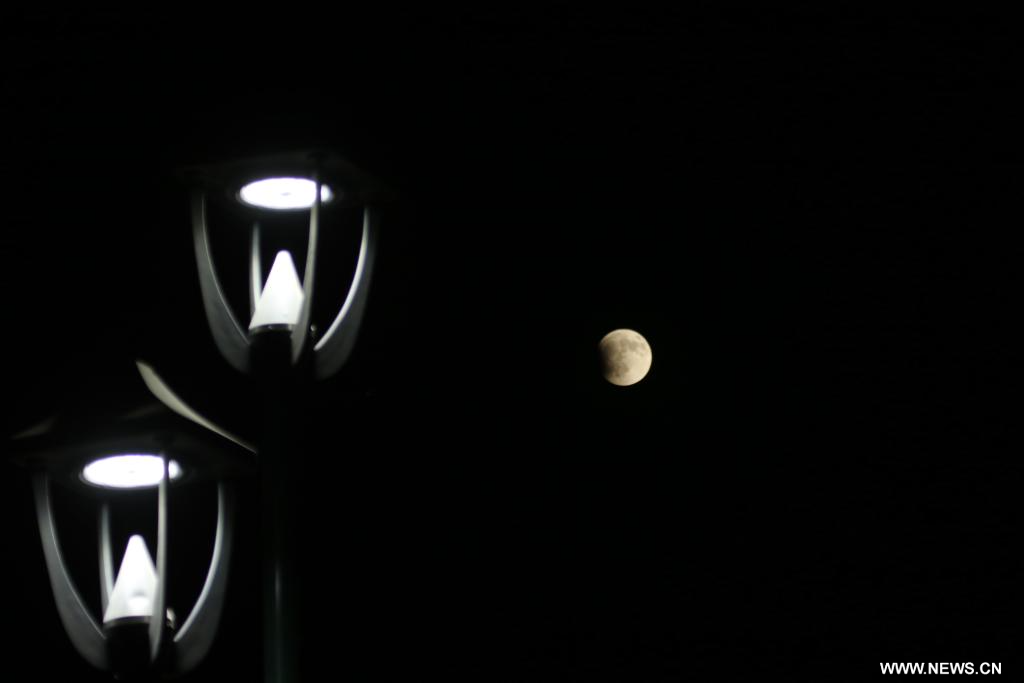 دمشق 8 سبتمبر 2025 (شينخوا) في الصورة الملتقطة يوم 7 سبتمبر 2025، مشهد لخسوف القمر في العاصمة السورية دمشق.