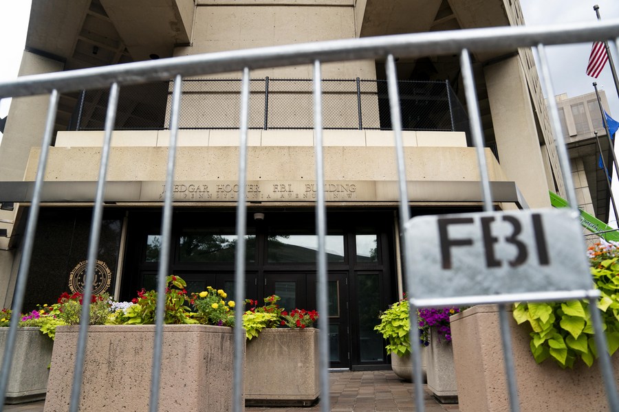 صورة ملتقطة في 15 أغسطس 2022 تظهر مقر مكتب التحقيقات الفيدرالي (أف بي آي) خلف سياج أمني في العاصمة الأمريكية واشنطن. (شينخوا)