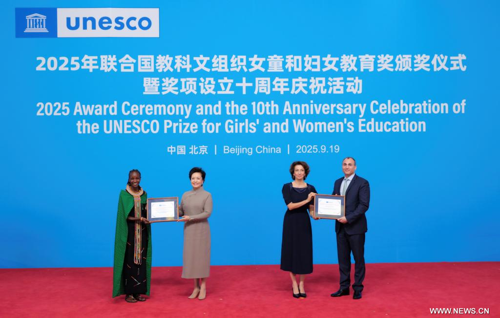بكين 19 سبتمبر 2025 (شينخوا) حضرت بنغ لي يوان، عقيلة الرئيس الصيني شي جين بينغ، وأودري أزولاي، المديرة العامة لمنظمة الأمم المتحدة للتربية والعلم والثقافة (يونسكو)، حفل توزيع جائزة اليونسكو لتعليم الفتيات والنساء لعام 2025 والاحتفال بالذكرى السنوية الـ10 لإنشاء الجائزة، في بكين اليوم (الجمعة).