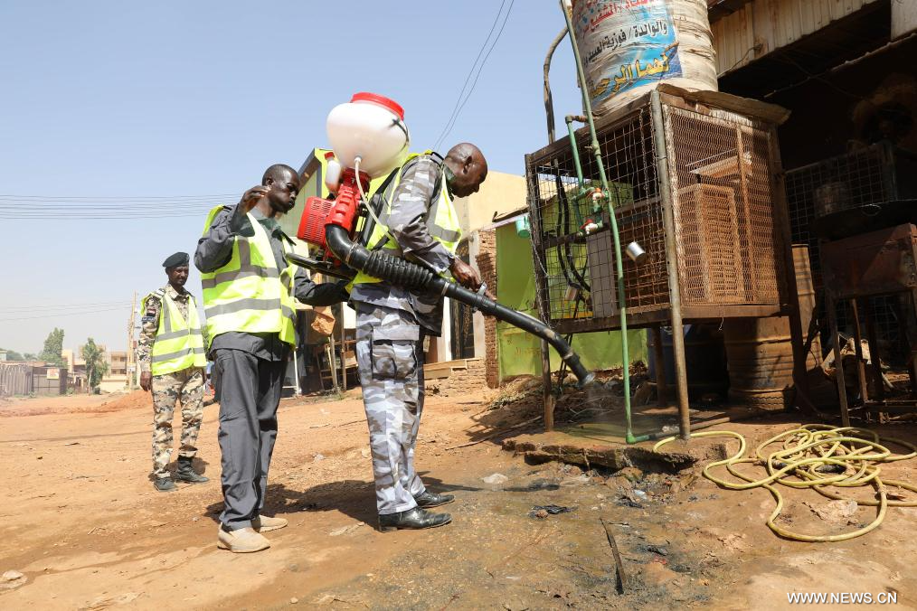أم درمان أول أكتوبر 2025 (شينخوا) في الصورة الملتقطة يوم 30 سبتمبر 2025، موظفون بقوات الدفاع المدني السودانية يرشون المبيد الحشري بحي الواحة في مدينة أم درمان شمالي العاصمة السودانية الخرطوم.