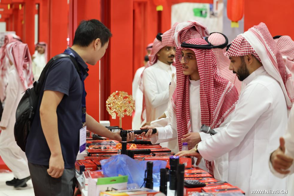 الرياض 8 أكتوبر 2025 (شينخوا) في الصورة الملتقطة يوم 6 أكتوبر 2025، زوار يبتاعون معدات للاستخدام في الأنشطة الخارجية، في الجناح الصيني خلال معرض الصقور والصيد السعودي الدولي 2025، في الرياض، السعودية.