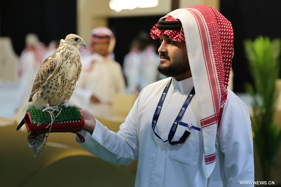 الرياض 8 أكتوبر 2025 (شينخوا) في الصورة الملتقطة يوم 6 أكتوبر 2025، رجل يحمل صقرا خلال معرض الصقور والصيد السعودي الدولي 2025، في الرياض، السعودية.