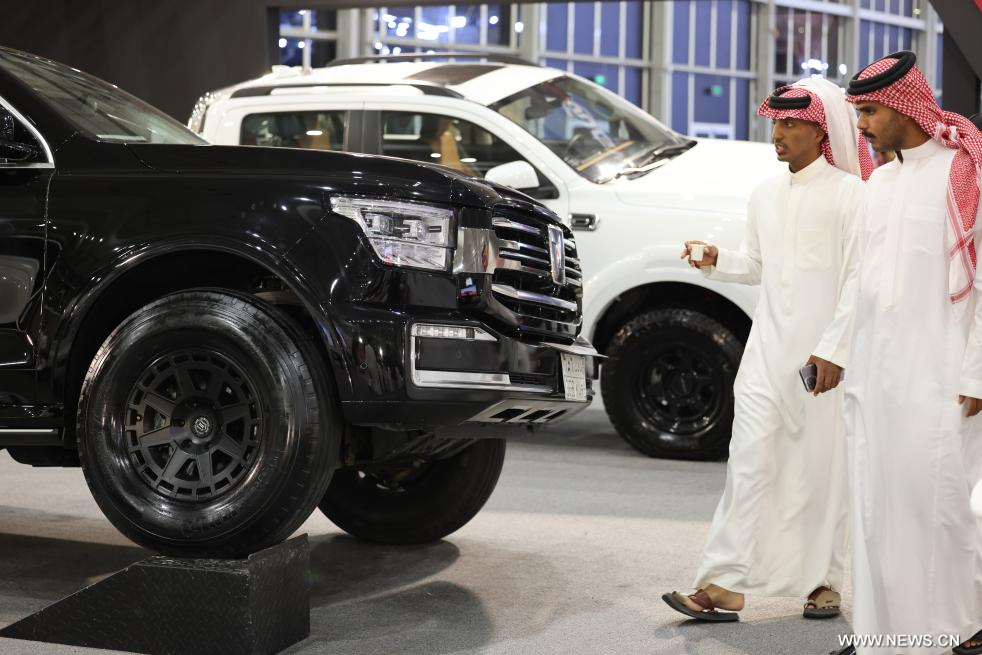 الرياض 8 أكتوبر 2025 (شينخوا) في الصورة الملتقطة يوم 6 أكتوبر 2025، زائران يتفقدان مركبات طرق وعرة صينية الصنع خلال معرض الصقور والصيد السعودي الدولي 2025 في الرياض، السعودية.