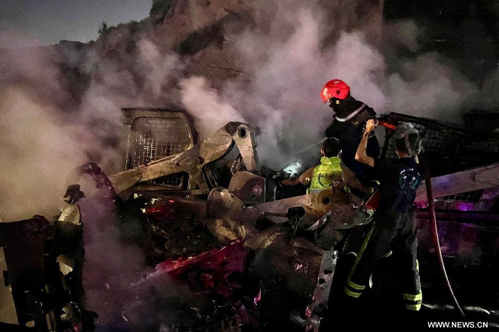 المصيلح، لبنان، 11 أكتوبر 2025 (شينخوا) في الصورة الملتقطة يوم 11 أكتوبر 2025، رجال إطفاء يحاولون إخماد النيران المشتعلة في مركبات ثقيلة دُمرت إثر غارات جوية إسرائيلية على منطقة المصيلح جنوبي لبنان.