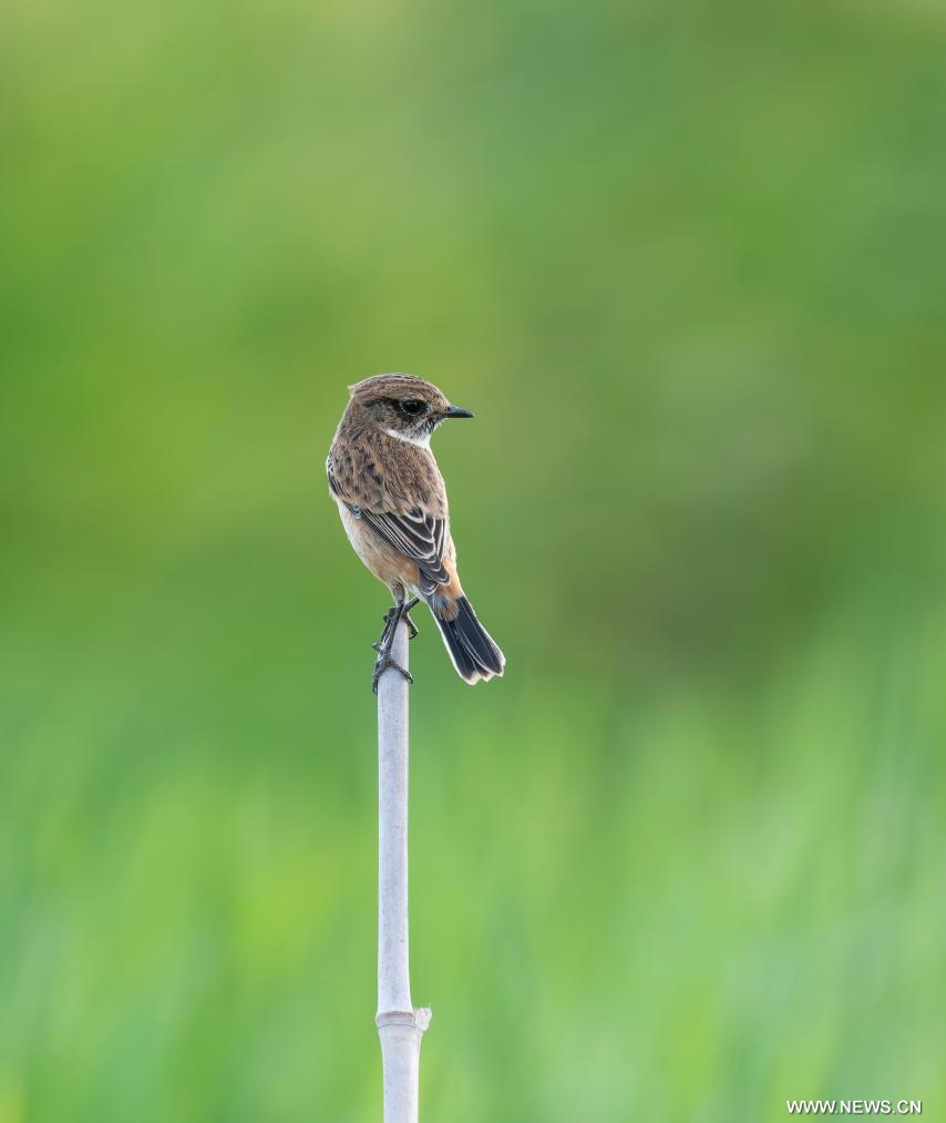 فوتشو 12 أكتوبر 2025 (شينخوا) في الصورة الملتقطة يوم 7 أكتوبر 2025، طائر قليعي سيبيري يستريح على قصبة في قرية كونغيوان في فوتشو بمقاطعة فوجيان في جنوب شرقي الصين.