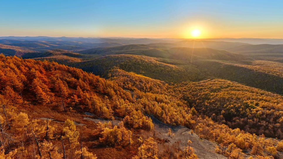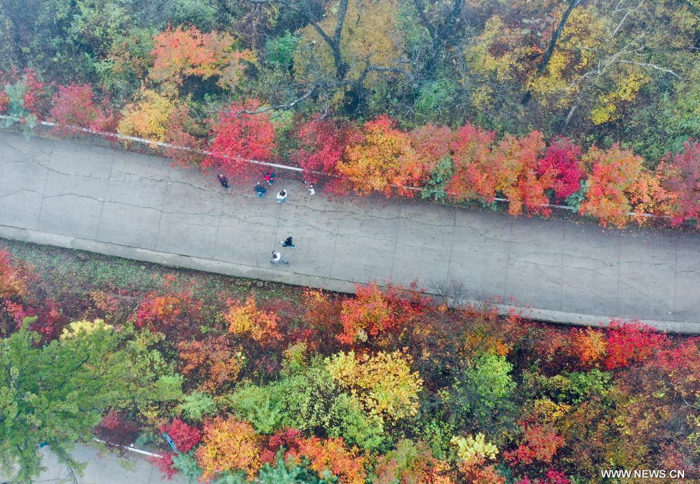 داندونغ 12 أكتوبر 2025 (شينخوا) في الصورة الملتقطة يوم 11 أكتوبر 2025، منظر جوي خلاب للغابات مع حلول موسم الخريف في منطقة تيانتشياوقو السياحية بمدينة داندونغ في مقاطعة لياونينغ بشمال شرقي الصين.