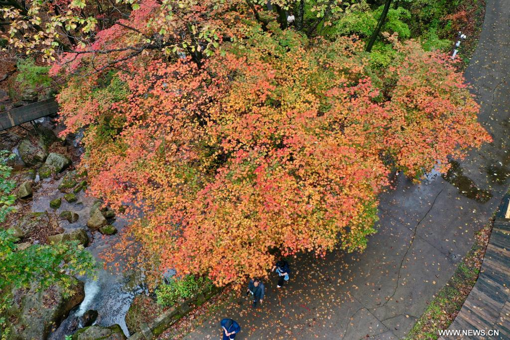 داندونغ 12 أكتوبر 2025 (شينخوا) في الصورة الملتقطة يوم 11 أكتوبر 2025، منظر جوي خلاب للأشجار مع حلول موسم الخريف في منطقة تيانتشياوقو السياحية بمدينة داندونغ في مقاطعة لياونينغ بشمال شرقي الصين.