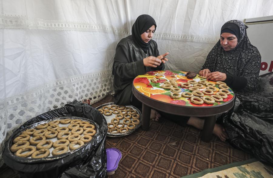 سيدتان فلسطينيتان تقومان بإعداد الكعك التقليدي قبيل حلول عيد الفطر في مخيم جباليا للاجئين بشمال قطاع غزة في 27 مارس 2025. (شينخوا)