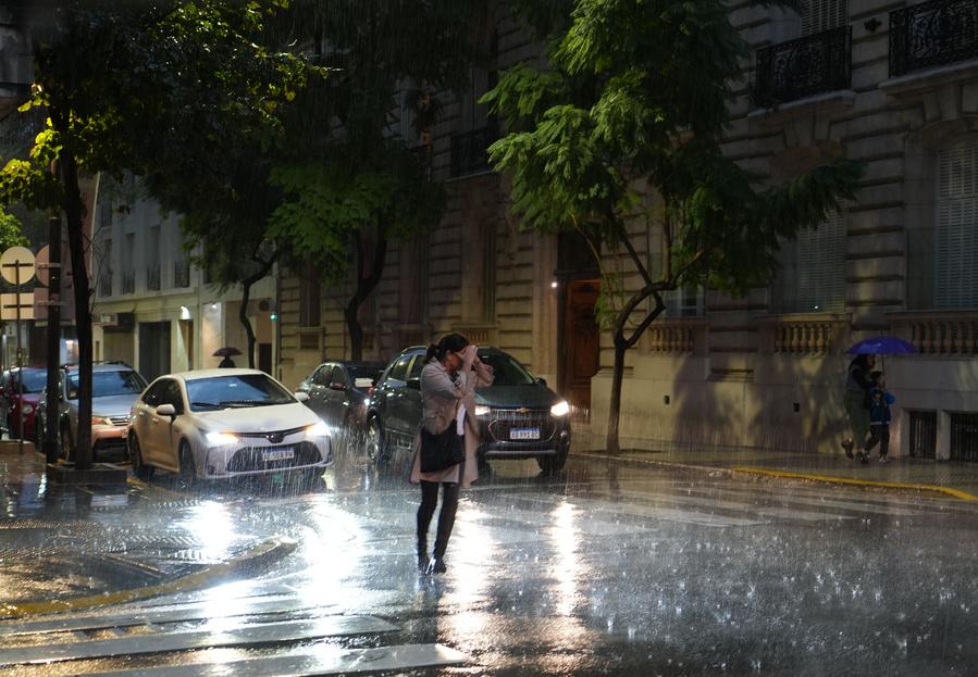 امرأة تسير تحت قطرات المطر في أحد شوارع بوينس آيرس بالأرجنتين يوم 17 مايو 2025. (شينخوا)