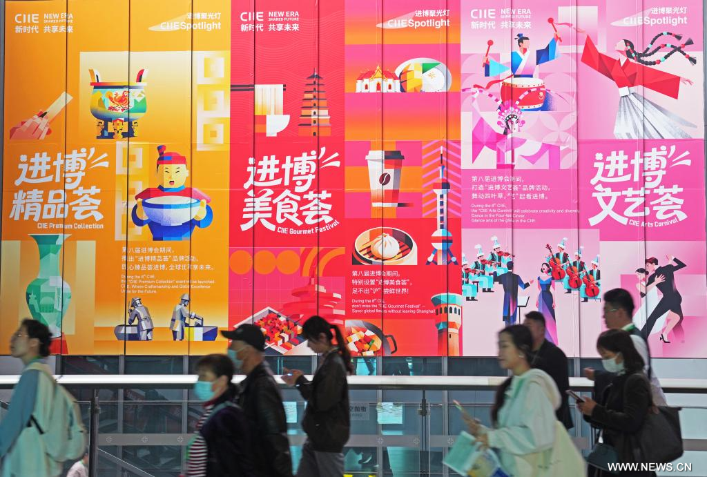 شانغهاي 9 نوفمبر 2025 (شينخوا) في الصورة الملتقطة يوم 8 نوفمبر 2025، زوار يمرون أمام الملصقات خلال الدورة الثامنة لمعرض الصين الدولي للاستيراد في بلدية شانغهاي بشرقي الصين.