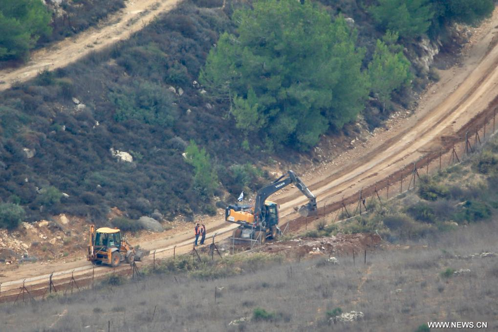 يارون 17 نوفمبر 2025 (شينخوا) في الصورة الملتقطة يوم 16 نوفمبر 2025، عمال إسرائيليون يستخدمون آلات ثقيلة لبناء جدار عند حدود بلدة يارون جنوبي لبنان.