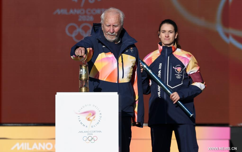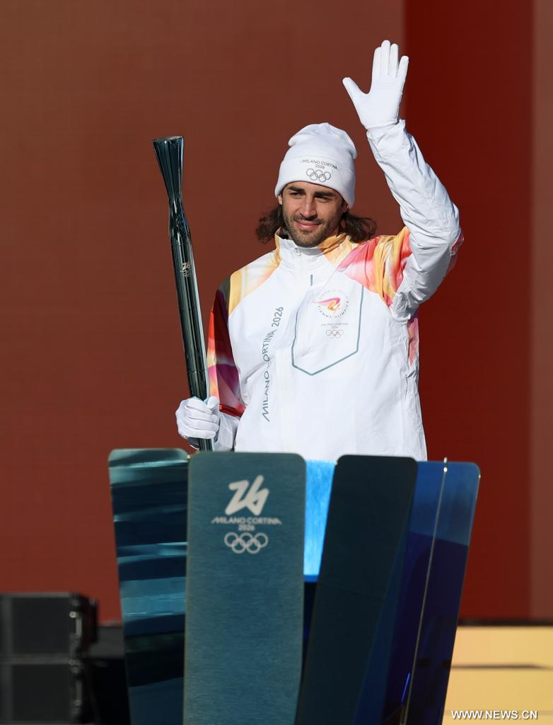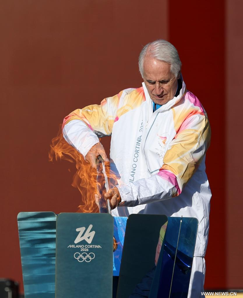 وفي حوالي الساعة 9:50 صباحا، حمل جيانكارلو بيريس، آخر حاملي الشعلة في دورة روما للألعاب الأولمبية الشتوية لعام 1960، الشعلة إلى منصة الإطلاق. وأوقد جيوفاني مالاغو، رئيس اللجنة المنظمة لدورة ميلانو-كورتينا 2026، الشعلة في مرجل.