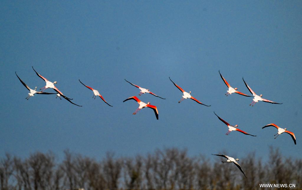 طيور النحام تحلق فوق أراض رطبة في شرقي الصين