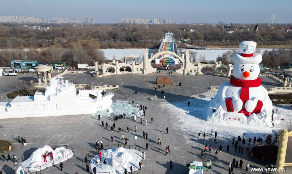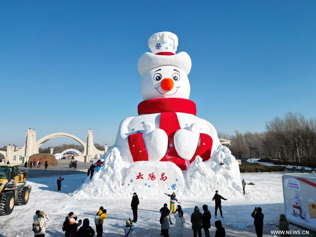 هاربين 10 ديسمبر 2025 (شينخوا) في الصورة الملتقطة يوم 9 ديسمبر 2025، رجل ثلج عملاق يبلغ ارتفاعه 23.8 متر ومصنوع من 5000 متر مكعب من الثلج في الموقع السياحي "جزيرة الشمس" بمدينة هاربين، حاضرة مقاطعة هيلونغجيانغ بشمال شرقي الصين.