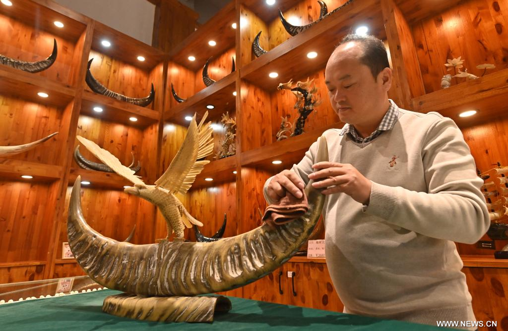 ناننينغ 17 ديسمبر 2025 (شينخوا) في الصورة الملتقطة يوم 16 ديسمبر 2025، أحد ورثة تقنية النحت باستخدام قرون الثور يعرض عملا فنيا مصنوعا من قرون الثور في قاعدة نموذجية لصناعة منتجات قرون الثور في بلدة وولينغ بمدينة ناننينغ حاضرة منطقة قوانغشي ذاتية الحكم لقومية تشوانغ في جنوبي الصين.