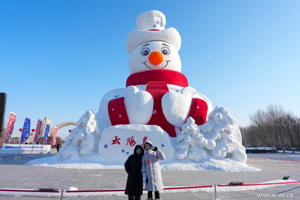 هاربين 27 ديسمبر 2025 (شينخوا) في الصورة الملتقطة يوم 26 ديسمبر 2025، زائرتان تلتقطان صورة أمام تمثال ثلجي في معرض جزيرة الشمس الدولي الـ38 لفنون النحت على الثلج في مدينة هاربين حاضرة مقاطعة هيلونغجيانغ بشمال شرقي الصين.