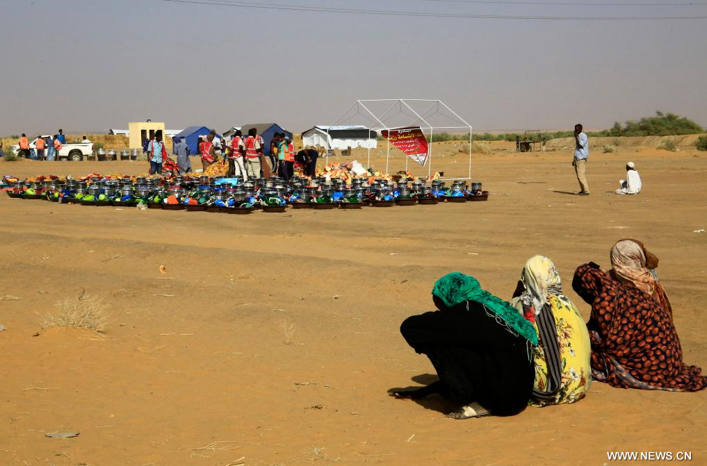في الصورة الملتقطة يوم 13 نوفمبر 2025، نازحون يحملون مساعدات إنسانية في مخيم العفاض للنازحين في مدينة الدبة شمالي السودان.