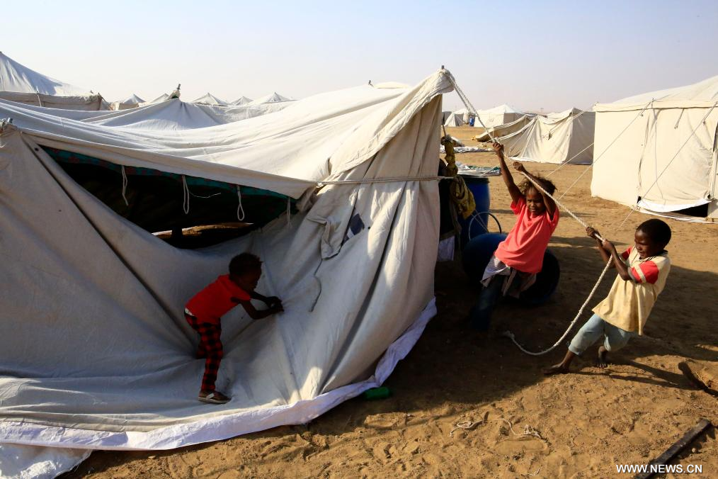 في الصورة الملتقطة يوم 13 نوفمبر 2025، أطفال نازحون ينصبون خيمة في مخيم العفاض للنازحين في مدينة الدبة شمالي السودان.