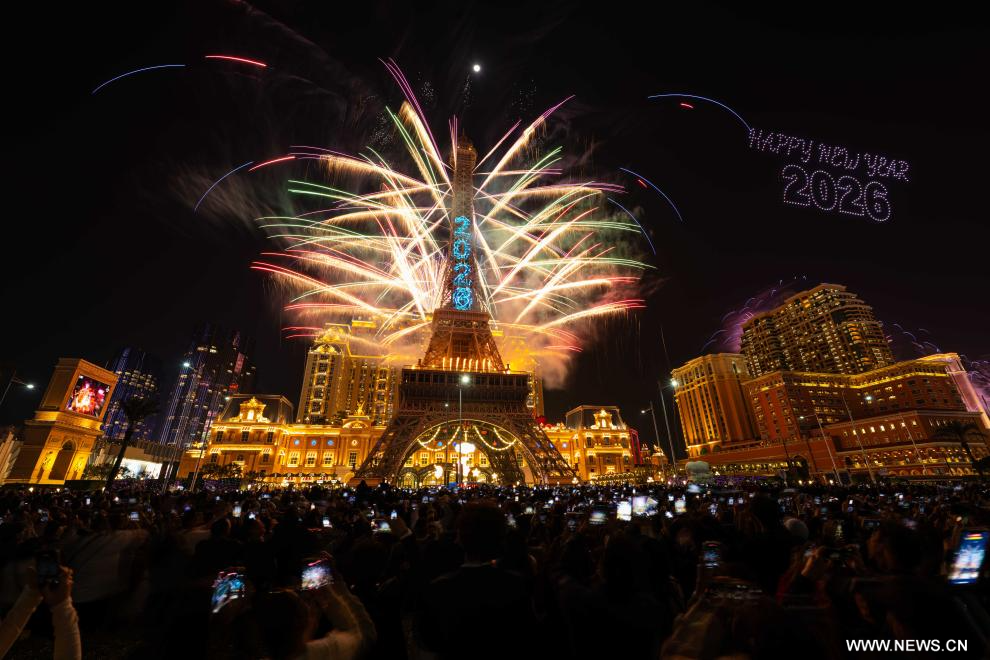 بكين أول يناير 2026 (شينخوا) في الصورة الملتقطة يوم أول يناير 2026، عروض ألعاب نارية رائعة في منطقة ماكاو الإدارية الخاصة، حيث أقيمت احتفالات منوعة لاستقبال العام الجديد 2026 في أنحاء الصين.