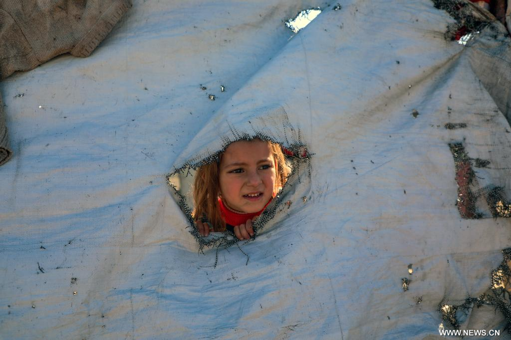 غزة 12 يناير 2026 (شينخوا) في الصورة الملتقطة يوم 11 يناير 2026، طفلة فلسطينية نازحة في مخيم مؤقت بالقرب من مكب نفايات في مدينة غزة.