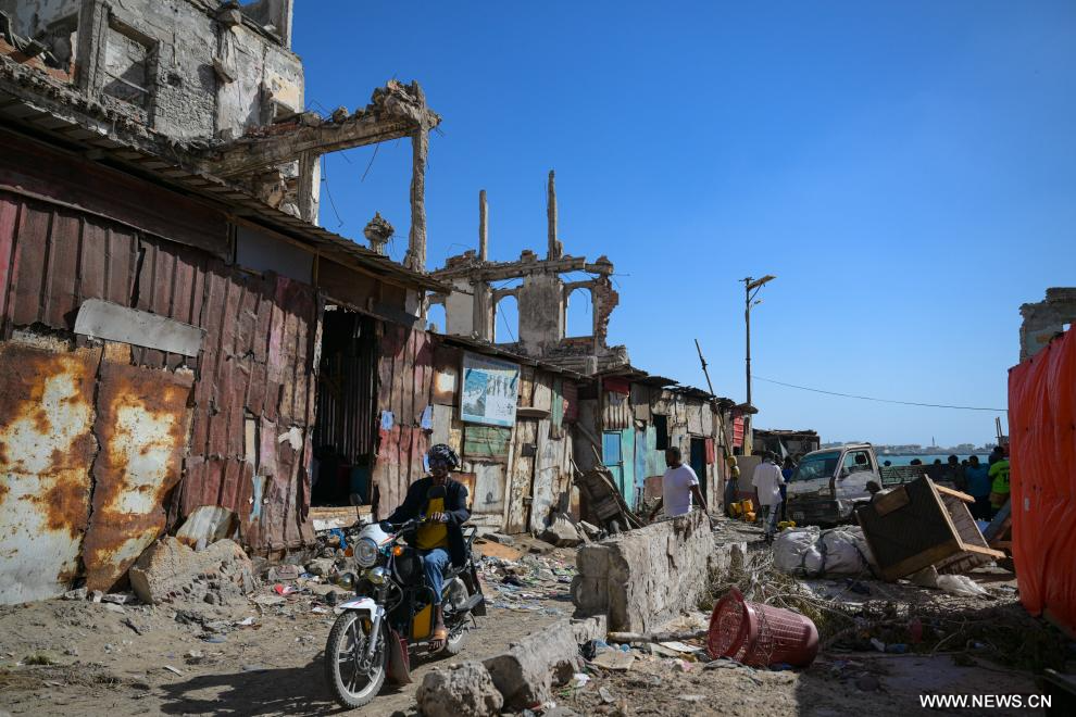 مقديشو 15 يناير 2026 (شينخوا) في الصورة الملتقطة يوم 11 يناير 2026، تاجر يركب دراجة نارية بجوار رصيف ميناء في مقديشو، الصومال.