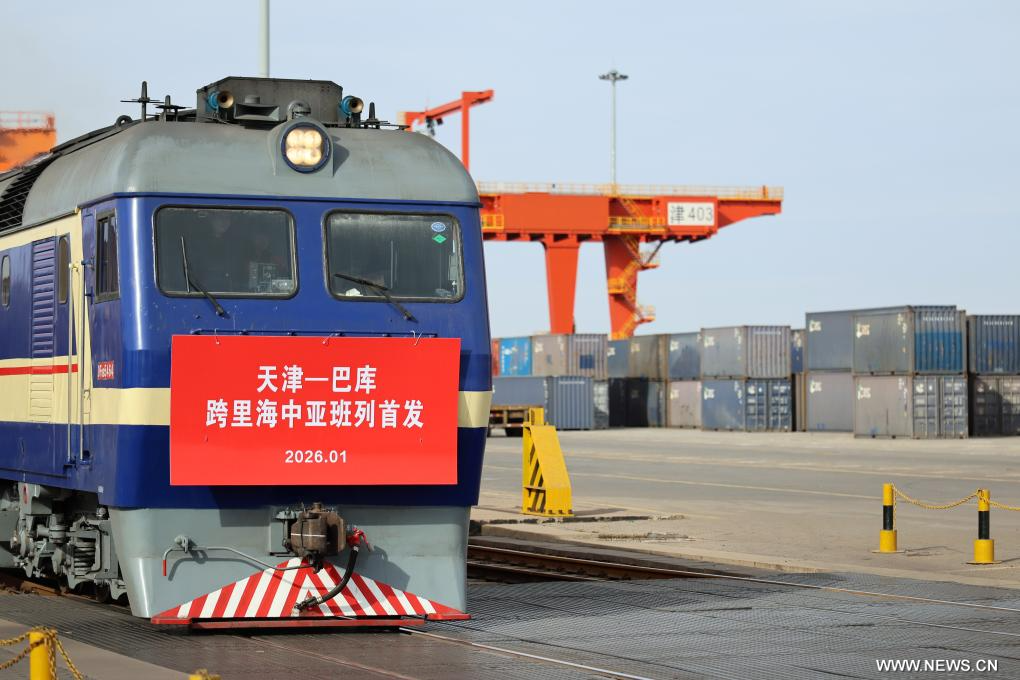 تيانجين 20 يناير 2026 (شينخوا) غادر أول قطار شحن عبر بحر قزوين بين الصين وآسيا الوسطى بلدية تيانجين شمالي الصين يوم الاثنين الماضي، متجها إلى باكو في أذربيجان، حيث يحمل على متنه بضائع مثل الأنابيب الفولاذية المقاومة للصدأ واللوازم اليومية.