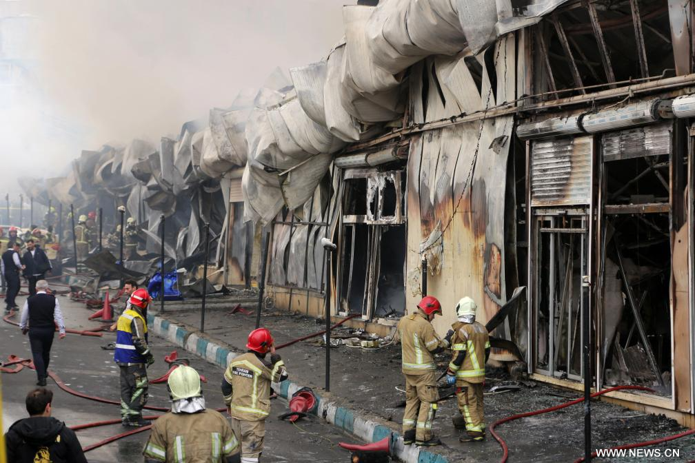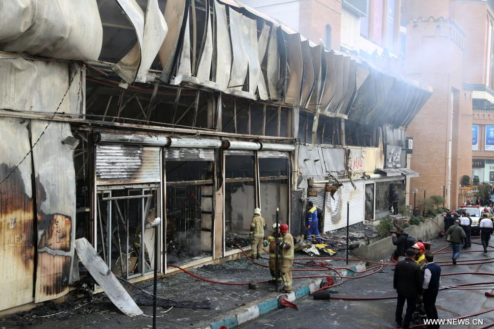 طهران 3 فبراير 2026 (شينخوا) في الصورة الملتقطة يوم 3 فبراير 2026، رجال إطفاء يعملون في موقع حريق في سوق في طهران، إيران.