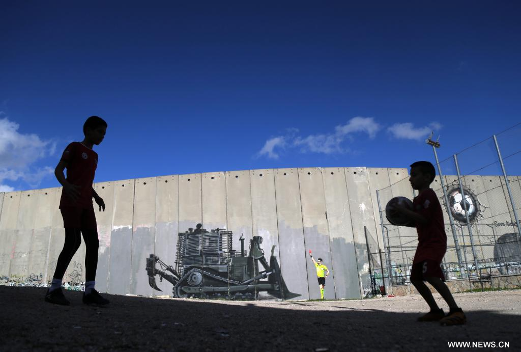 بيت لحم 12 فبراير 2026 (شينخوا) في الصورة الملتقطة يوم 11 فبراير 2026، طفلان فلسطينيان يلعبان كرة القدم في مدينة بيت لحم بالضفة الغربية.