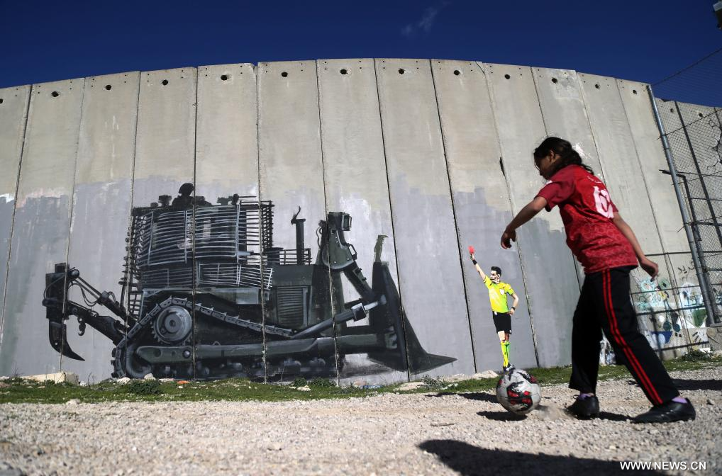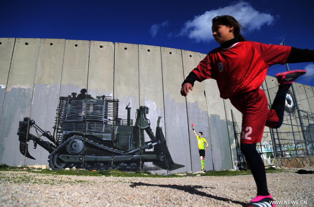 بيت لحم 12 فبراير 2026 (شينخوا) في الصورة الملتقطة يوم 11 فبراير 2026، طفلة فلسطينية تلعب كرة القدم في مدينة بيت لحم بالضفة الغربية.