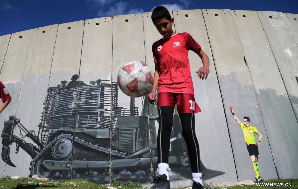 بيت لحم 12 فبراير 2026 (شينخوا) في الصورة الملتقطة يوم 11 فبراير 2026، طفل فلسطيني يلعب كرة القدم في مدينة بيت لحم بالضفة الغربية.