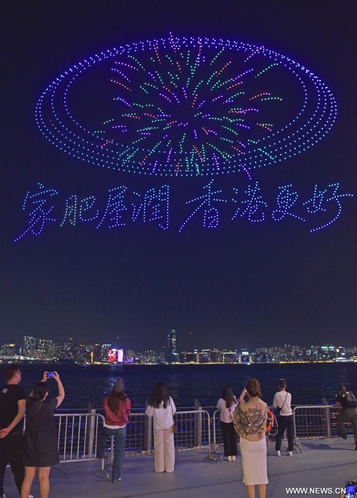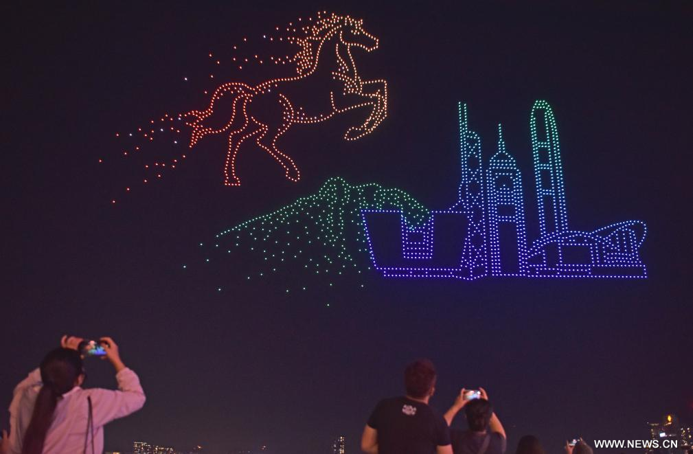 هونغ كونغ 15 فبراير 2026 (شينخوا) في الصورة الملتقطة يوم 14 فبراير 2026، زوار يشاهدون عروضا رائعة تقدمها 2026 طائرة بدون طيار في منطقة هونغ كونغ الإدارية الخاصة بجنوبي الصين.