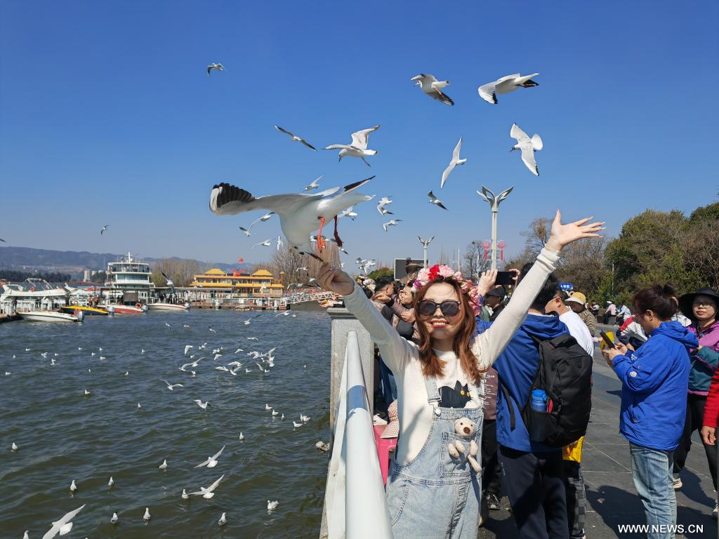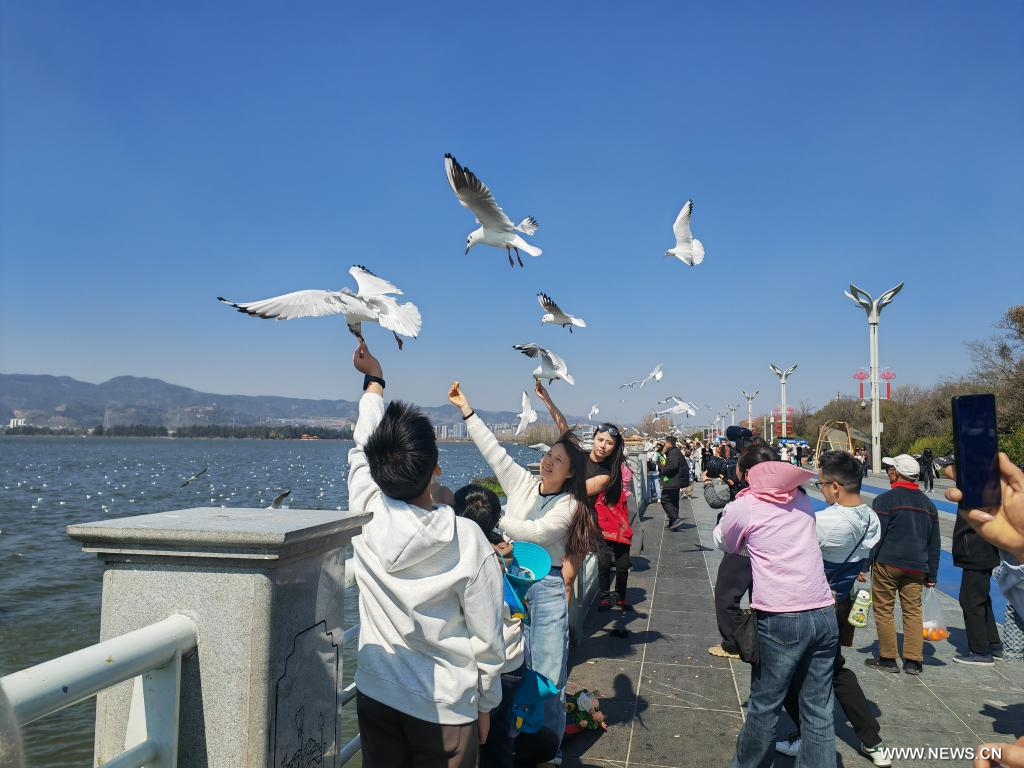 كونمينغ 17 فبراير 2026 (شينخوا) في الصورة الملتقطة يوم 16 فبراير 2026، زوار يطعمون طيور النورس أحمر المنقار عند سد هايقنغ في مدينة كونمينغ، حاضرة مقاطعة يوننان في جنوب غربي الصين، حيث تجمع العديد من الزوار والمقيمين المحليين عند السد للاستمتاع بعطلة عيد الربيع.