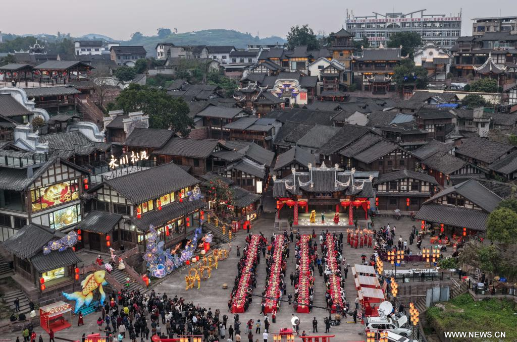 بكين 17 فبراير 2026 (شينخوا) في الصورة الملتقطة يوم 16 فبراير 2026، أناس يستمتعون بمأدبة كبيرة احتفالا بليلة رأس السنة الصينية التقليدية الجديدة في بلدة سونغقاي القديمة ببلدية تشونغتشينغ جنوب غربي الصين.
