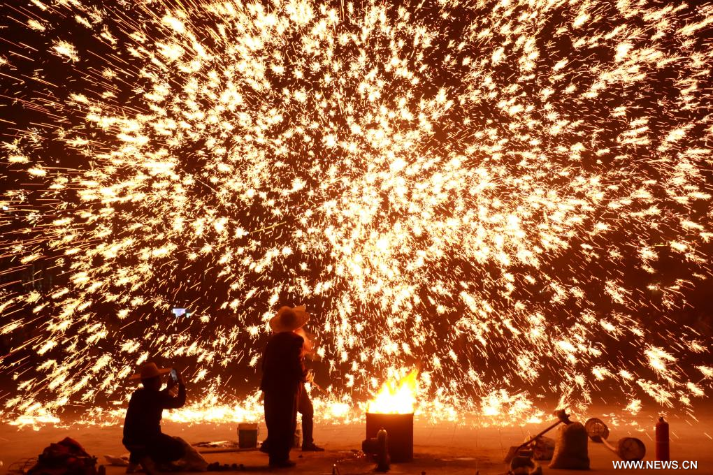 بكين 17 فبراير 2026 (شينخوا) في الصورة الملتقطة يوم 14 فبراير 2026، فنانون يقدمون عرضا للألعاب النارية المصنوعة من الحديد المنصهر في مدينة آنيانغ بمقاطعة خنان في وسط الصين، احتفالا بعيد الربيع أو رأس السنة الصينية التقليدية الجديدة.