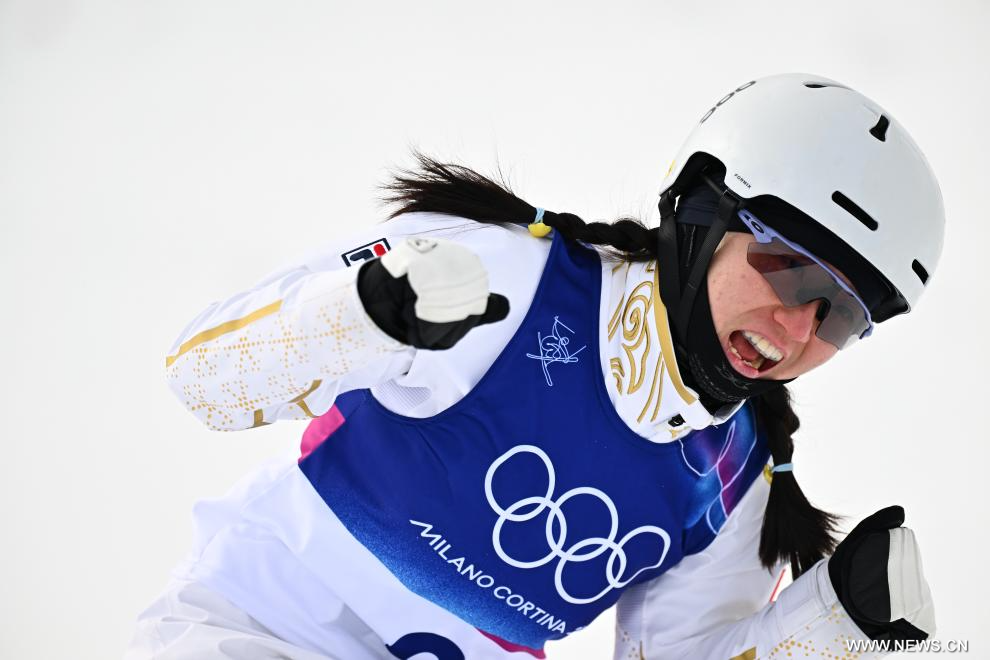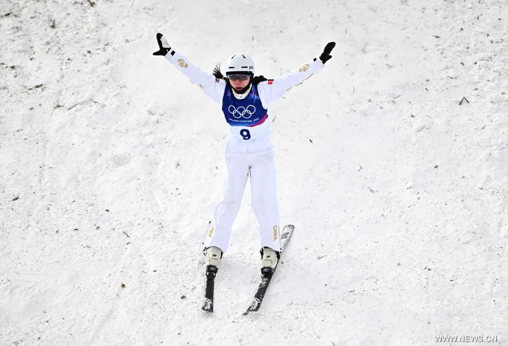 ليفينيو 18 فبراير 2026 (شينخوا) في الصورة الملتقطة يوم 18 فبراير 2026، الصينية كونغ فان يوي تتنافس خلال النهائي الأول لمنافسات التزلج الحر (القفزات الهوائية) للسيدات، ضمن دورة الألعاب الأولمبية الشتوية ميلانو-كورتينا 2026 في ليفينيو، إيطاليا.