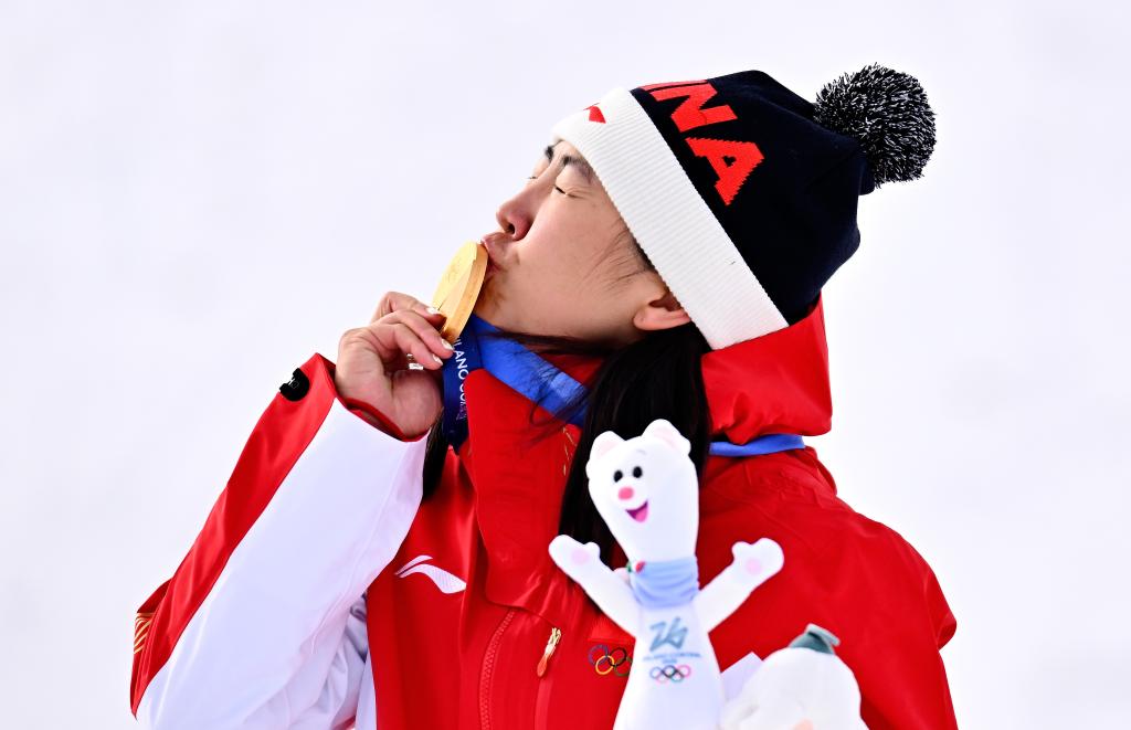 ليفينيو 18 فبراير 2026 (شينخوا) في الصورة الملتقطة يوم 18 فبراير 2026، اللاعبة الصينية الحائزة على الميدالية الذهبية شيوي منغ تاو تقبل الميدالية خلال حفل توزيع جوائز منافسات التزلج الحر (القفزات الهوائية) للسيدات، ضمن دورة الألعاب الأولمبية الشتوية ميلانو-كورتينا 2026 في ليفينيو، إيطاليا.
