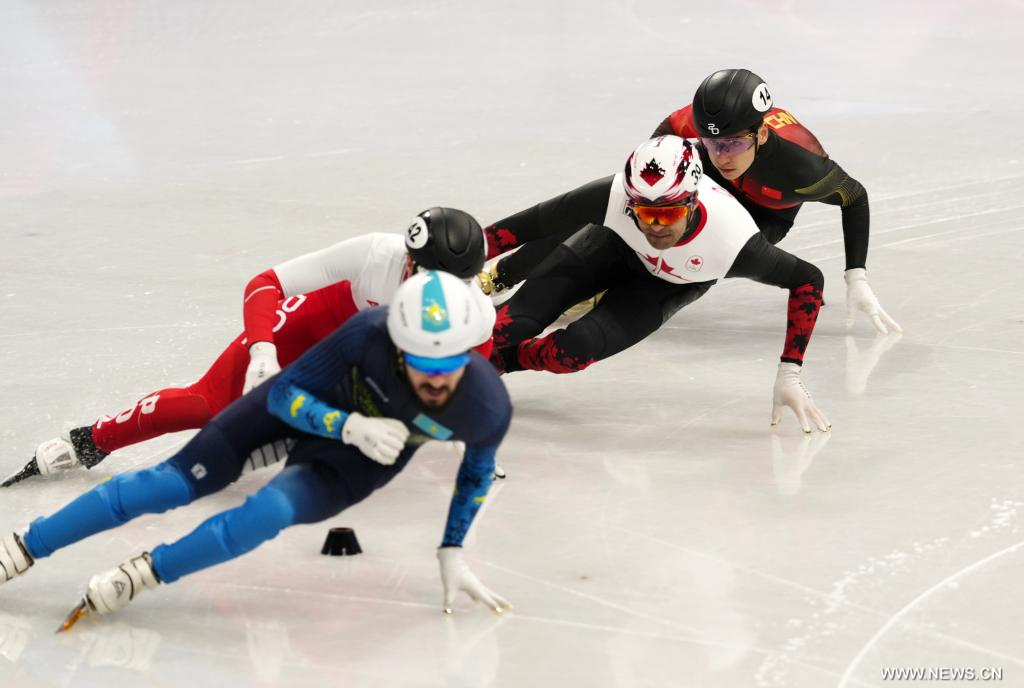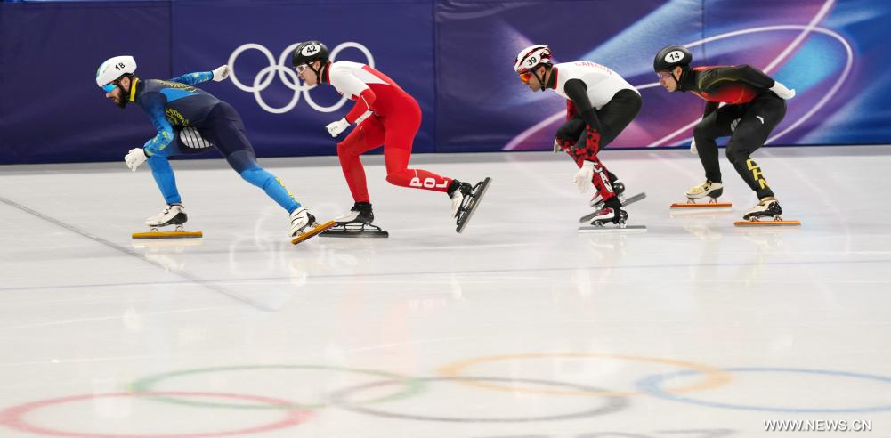 ميلانو 19 فبراير 2026 (شينخوا) في الصورة الملتقطة يوم 18 فبراير 2026، ليو شاو آنغ (أول يمين) من الصين، وماكسيم لاون (ثاني يمين) من كندا، وفيليكس بيجون (ثاني يسار) من بولندا، ودينيس نيكشا من كازاخستان، يتنافسون خلال نهائي (ب) لسباق 500 متر لتزلج السرعة على المضمار القصير للرجال ضمن فعاليات دورة الألعاب الأولمبية الشتوية ميلانو-كورتينا 2026، في ميلانو، إيطاليا.