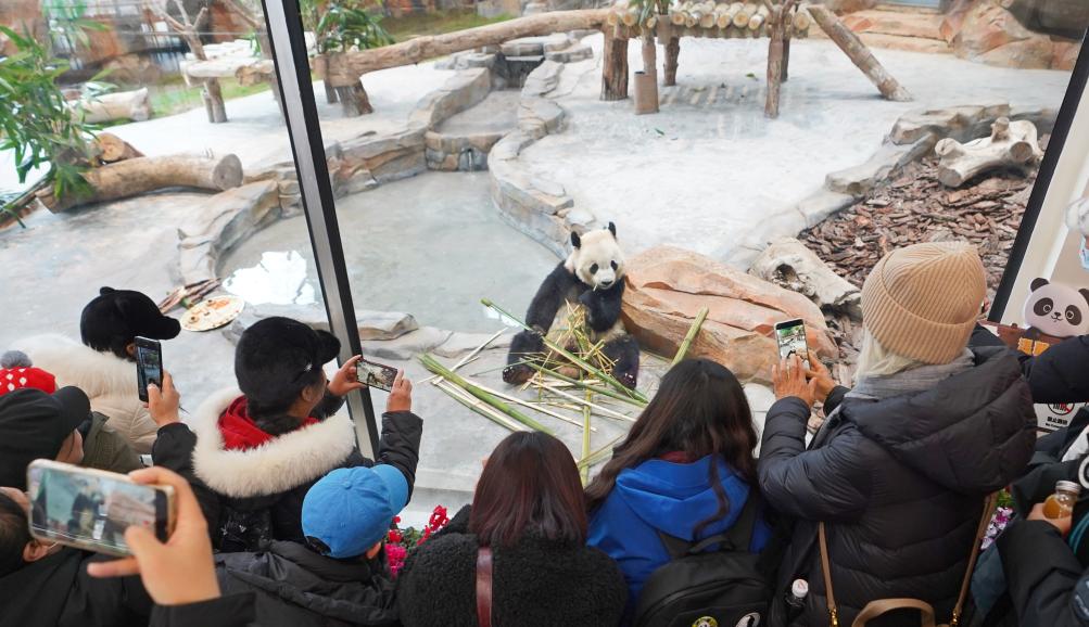 بكين 21 فبراير 2026 (شينخوا) في الصورة الملتقطة يوم 20 فبراير 2026، سياح يلتقطون صورا لباندا عملاقة في حديقة حيوان بمدينة أورومتشي، حاضرة منطقة شينجيانغ الويغورية ذاتية الحكم شمال غربي الصين، وذلك خلال عطلة عيد الربيع التي تمتد تسعة أيام هذا العام.