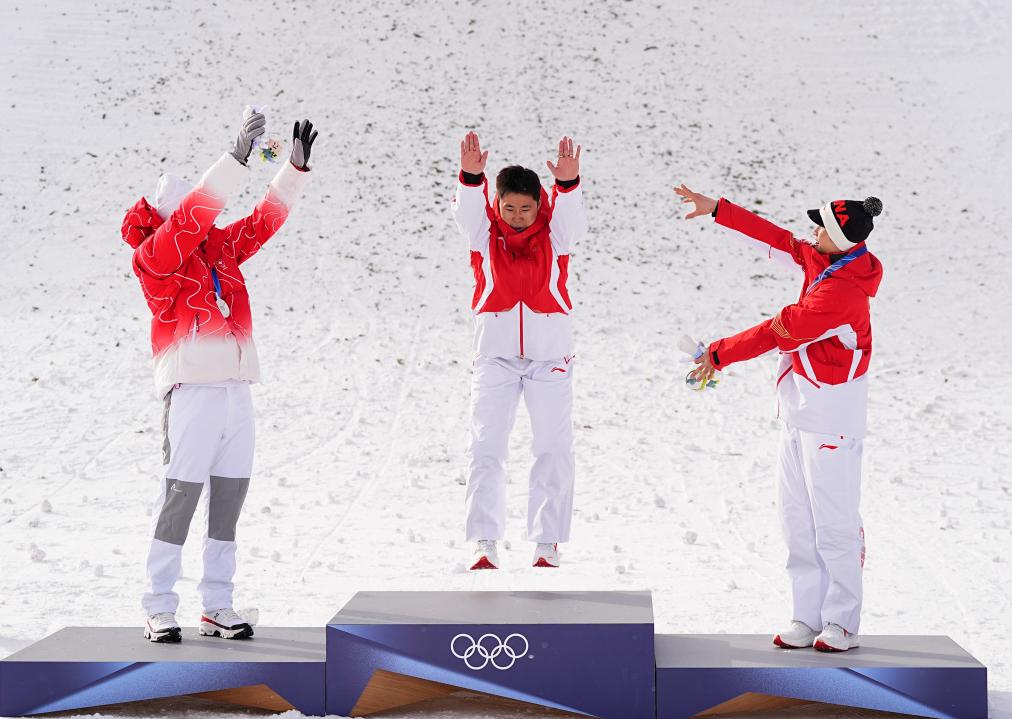 ليفينيو 20 فبراير 2026 (شينخوا) - في الصورة الملتقطة يوم 20 فبراير 2026، الصيني، وانغ شين دي (الوسط)، الحائز على الميدالية الذهبية، يقفز على منصة التتويج خلال مراسم توزيع الميداليات عقب مسابقة القفزات الهوائية في التزلج الحر للرجال، ضمن دورة الألعاب الأولمبية الشتوية ميلانو-كورتينا 2026، في ليفينيو، إيطاليا.