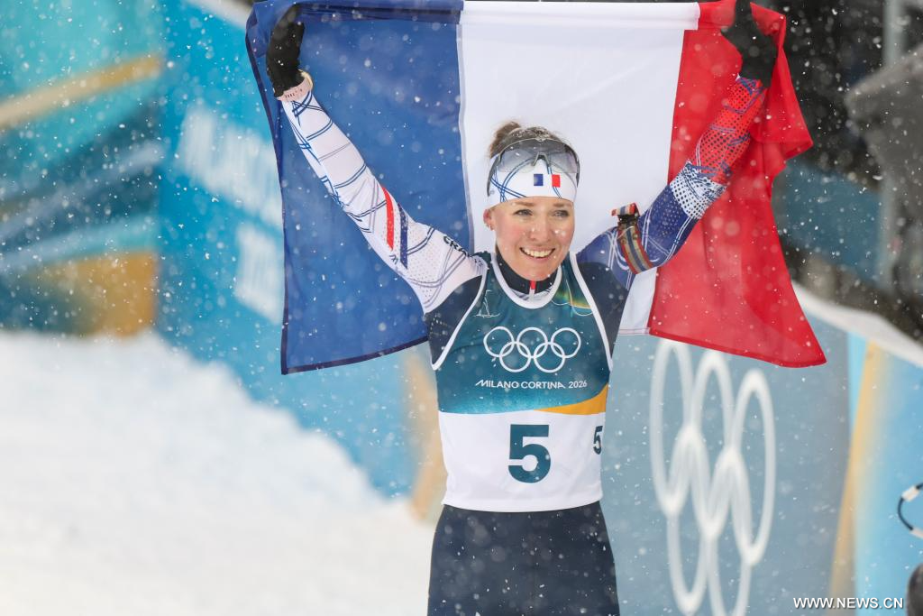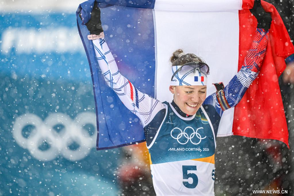 أنترسيلفا 22 فبراير 2026 (شينخوا) في الصورة الملتقطة يوم 21 فبراير 2026، الفرنسية أوسيان ميشيلون تحتفل عقب تصدرها سباق البياثلون للسيدات لمسافة 12.5 كم (انطلاق جماعي) ضمن فعاليات دورة الألعاب الأولمبية الشتوية ميلانو-كورتينا 2026 في أنترسيلفا، إيطاليا.