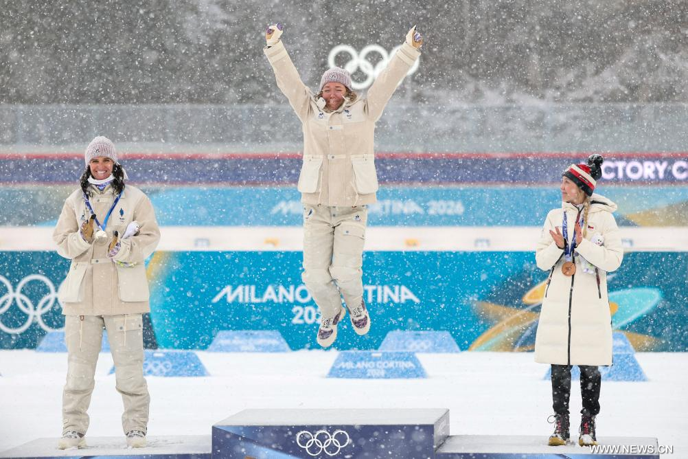 أنترسيلفا 22 فبراير 2026 (شينخوا) في الصورة الملتقطة يوم 21 فبراير 2026، الفرنسية أوسيان ميشيلون (وسط) تحتفل خلال مراسم تتويج سباق البياثلون للسيدات لمسافة 12.5 كم (انطلاق جماعي) ضمن فعاليات دورة الألعاب الأولمبية الشتوية ميلانو-كورتينا 2026 في أنترسيلفا، إيطاليا.