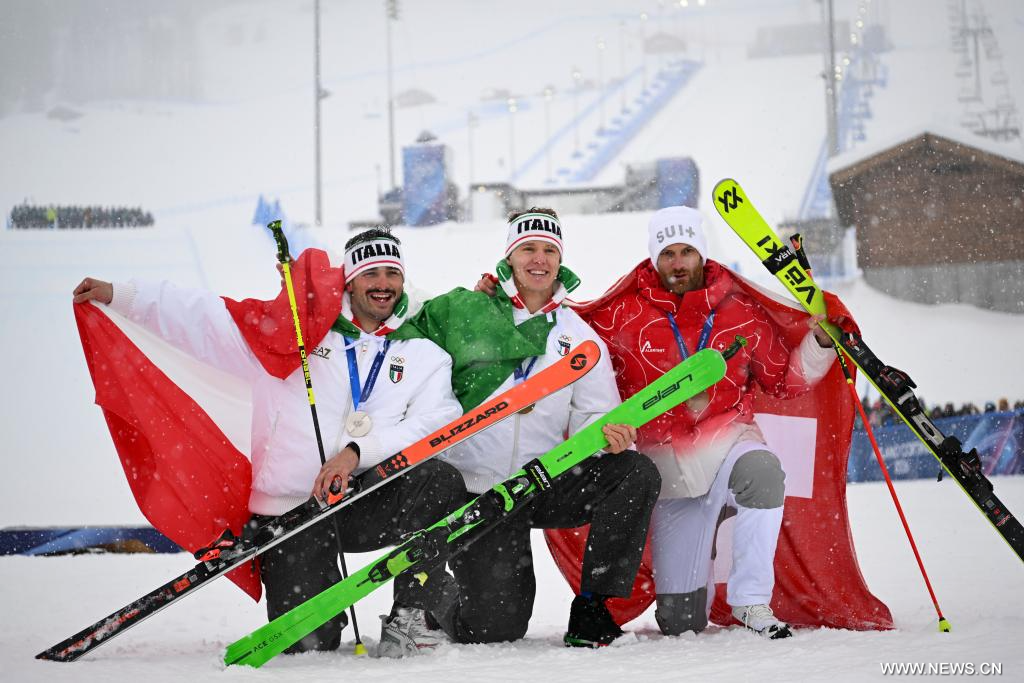 ليفينيو 22 فبراير 2026 (شينخوا) في الصورة الملتقطة يوم 21 فبراير 2026، الحائز على الميدالية الذهبية سيموني ديروميديس (وسط) من إيطاليا، والحائز على الميدالية الفضية فيديريكو توماسوني (يسار) من إيطاليا، والحائز على الميدالية البرونزية أليكس فيفا من سويسرا، يلتقطون صورا تذكارية خلال مراسم تتويج سباق التزلج المتقاطع للرجال في التزلج الحر ضمن فعاليات دورة الألعاب الأولمبية الشتوية ميلانو-كورتينا 2026 في ليفينيو، إيطاليا.