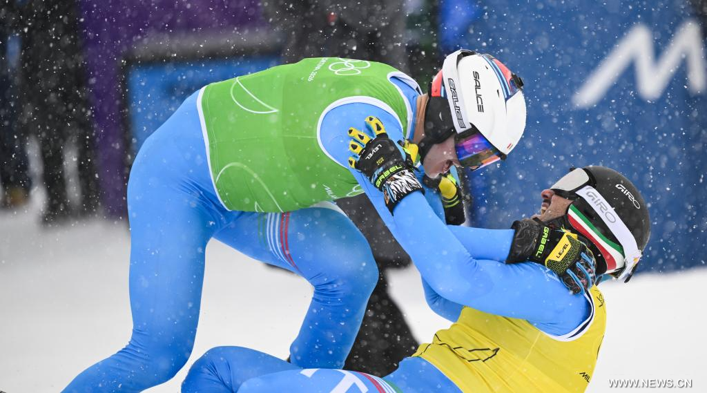 ليفينيو 22 فبراير 2026 (شينخوا) في الصورة الملتقطة يوم 21 فبراير 2026، لاعبا إيطاليا سيموني ديروميديس (يسار) وفيديريكو توماسوني يحتفلان بعد النهائي الكبير لسباق التزلج المتقاطع للرجال في التزلج الحر ضمن فعاليات دورة الألعاب الأولمبية الشتوية ميلانو-كورتينا 2026 في ليفينيو، إيطاليا.
