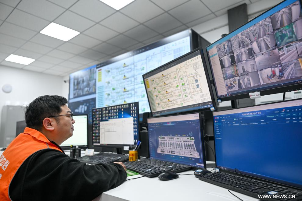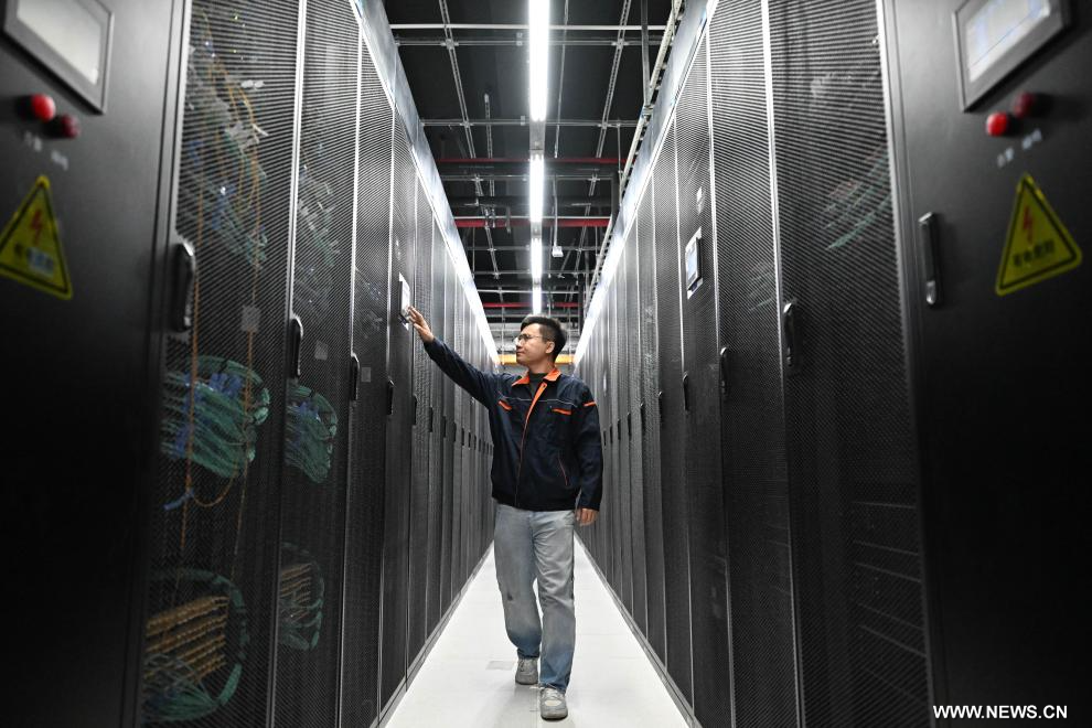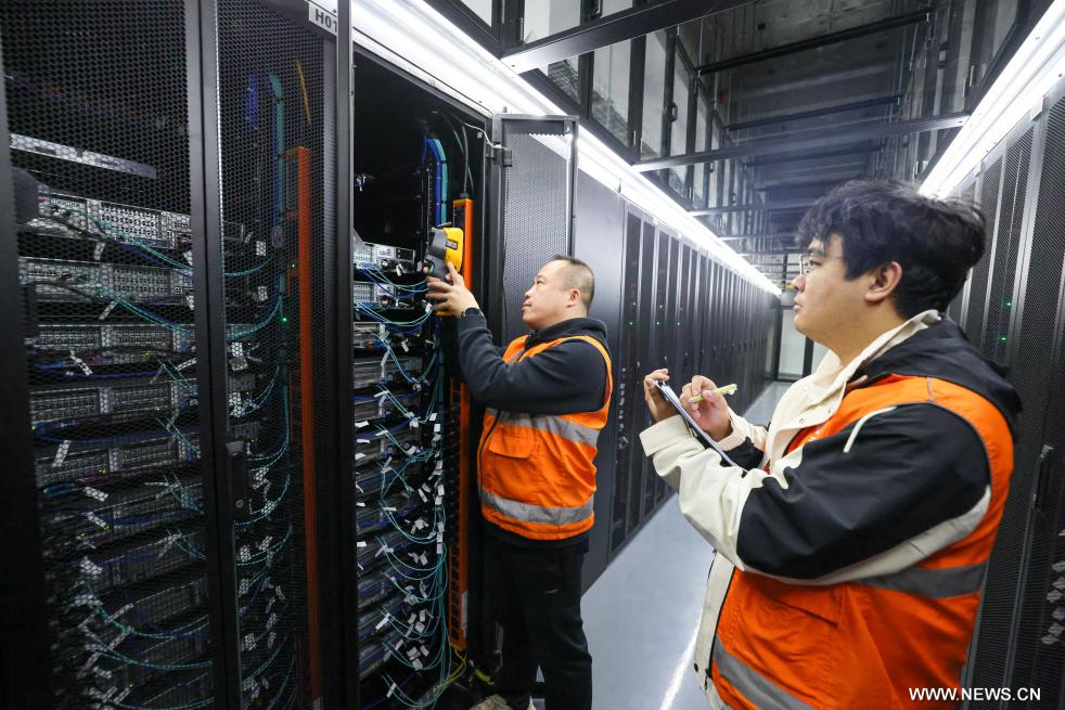 تيانجين 27 فبراير 2026 (شينخوا) في الصورة الملتقطة يوم 26 فبراير 2026، مهندس يقوم بإجراء فحص لخوادم الحوسبة الذكية في مركز الحوسبة الذكية التابع لشركة تشاينا تيليكوم في مجمع الابتكار للبيانات الذكية في مدينة بكين-تيانجين الصناعية الجديدة في شمالي بلدية تيانجين.