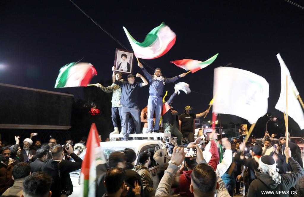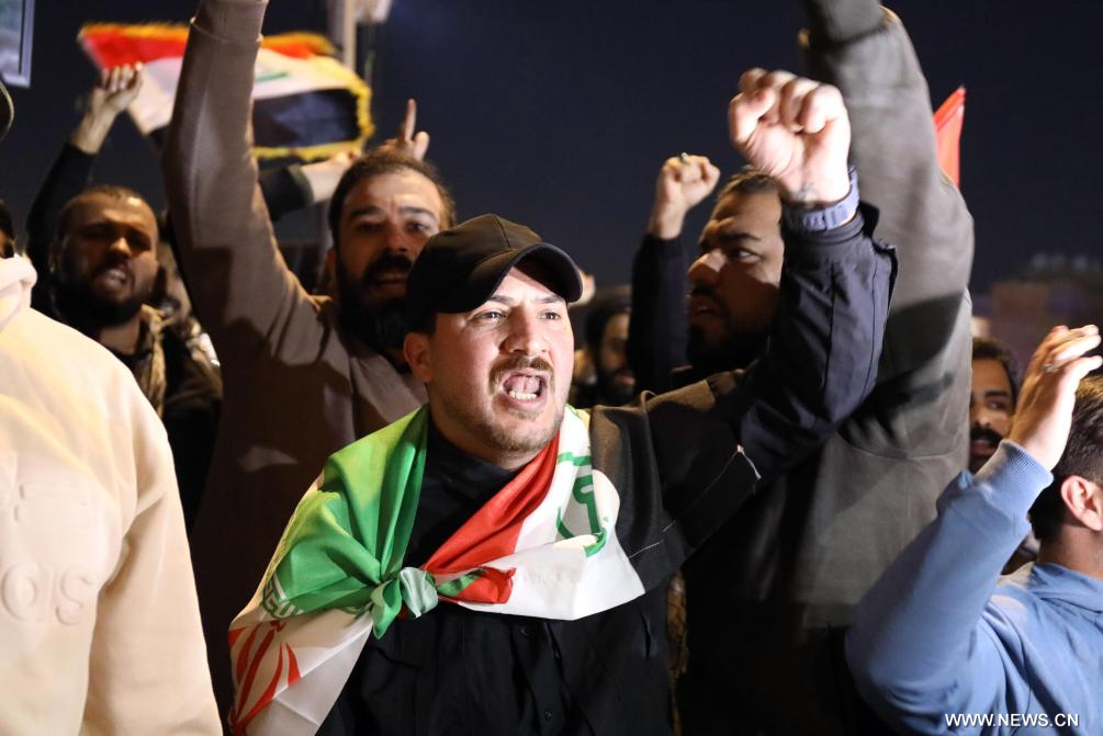 بغداد 28 فبراير 2026 (شينخوا) في الصورة الملتقطة يوم 28 فبراير 2026، عراقيون يشاركون في مظاهرة احتجاجية ضد الهجمات الأمريكية-الإسرائيلية على إيران، وذلك في العاصمة العراقية بغداد.